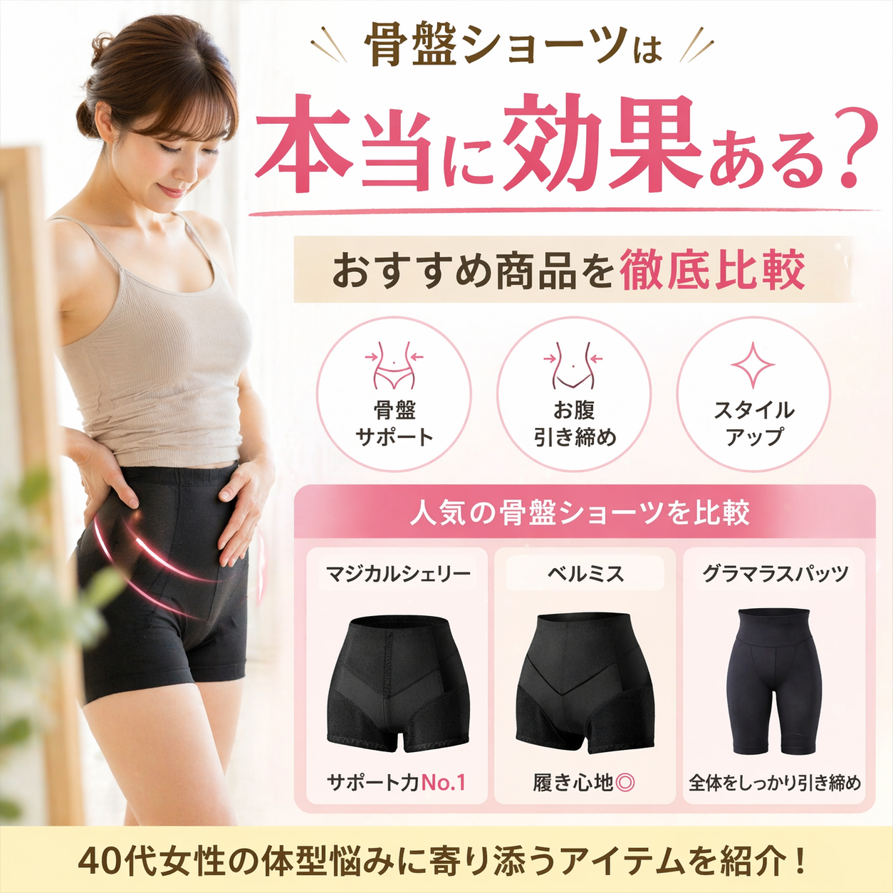 特に40代女性は、骨盤の歪みや姿勢の崩れが体型に影響していることが多いため、サポートアイテムとしては非常に有効です。