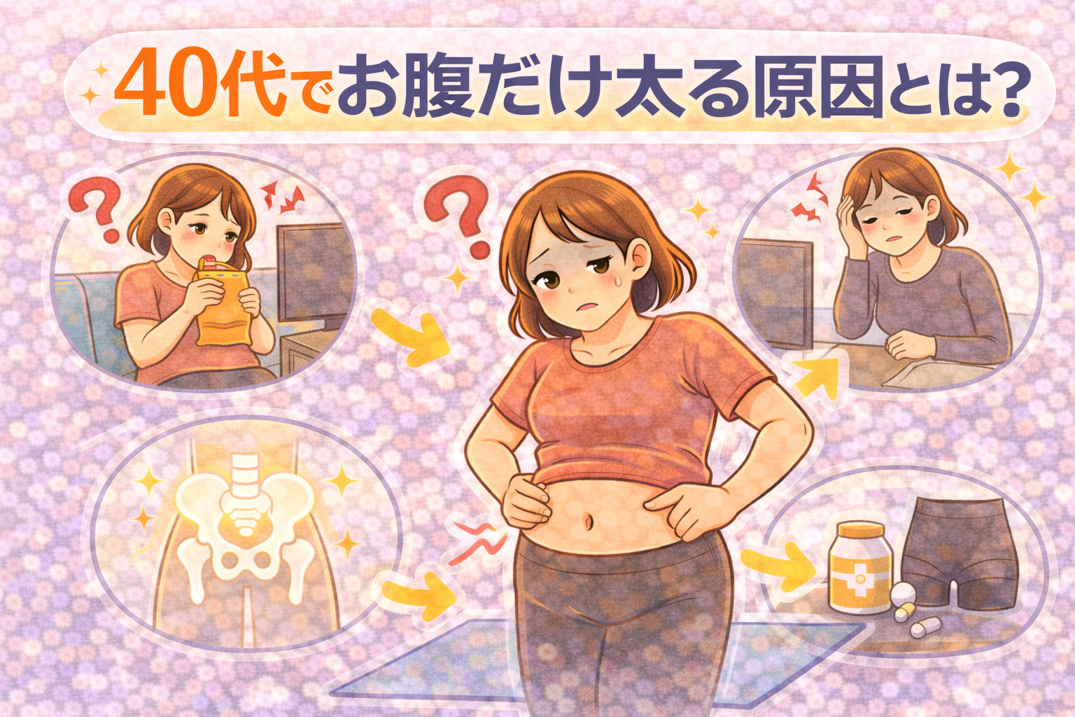 40代でお腹だけ太る原因は、基礎代謝の低下や筋力低下、骨盤の歪みなどが関係しています。
